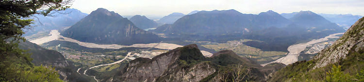 Infatti si possono ammirare le dolomiti venete, dal Pelmo al Peralba, al Coglians e proseguire fino alle Giulie spaziando sui Tauri a Nord e fino al mare a sud.