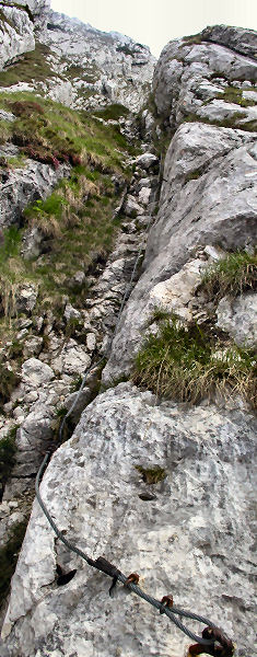 Ora è necessario risalire un facile canalino roccioso, molto ben appigliato, per poi proseguire fino a raggiungere l'ultimo ripido canale. Si risale servendosi delle ottime attrezzature presenti.