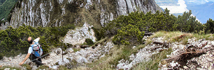 Si raggiunge uno spuntone roccioso che immette in un ulteriore breve canalino erboso.
