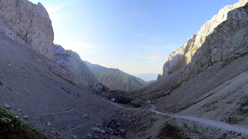 Seguiamo il sentiero a destra lasciandoci dietro il lago e la sua cornice di pareti bianche e lisce, per immetterci nella Valentin Torl, una piccola valle di incantevole bellezza.