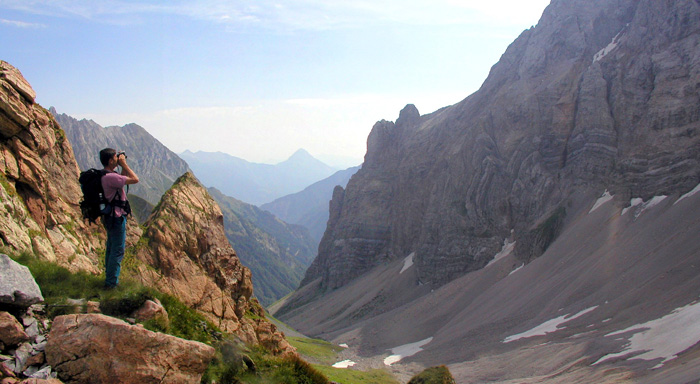 A destra la montagna imponente, alte placche rocciose, lunghe spaccature verticali, massi e ghiaie che diradano verso il basso dove riprendono prati verdi e dolci pendii che risalgono a sinistra, e noi in mezzo a tutto, senza pensieri, seguendo il rivolo asciutto di un torrente.